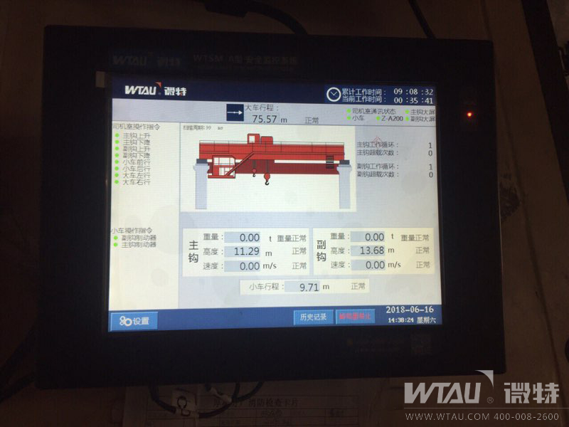 微特為大冶有色配備的WTSM-A型冶金橋式起重機安全監(jiān)控管理系統(tǒng),該系統(tǒng)具有實時監(jiān)控、動態(tài)顯示、聲光報警、數(shù)據(jù)備份、斷電記憶以及密碼保護等功能,且具有抗干擾性強,操行界面友好,通用性強等優(yōu)點。項目目前已得到當?shù)刭|(zhì)監(jiān)局和使用方的驗收認可,業(yè)主對此次合作表示非常滿意。