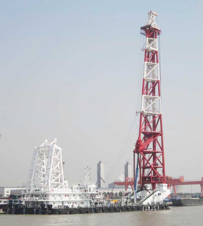 與國內(nèi)其他打樁船相比,“海威951”打樁船有三大特點:一是該船集打樁和吊裝為一體,一次最大抬吊重240噸,還可以做-27°到﹢25°的變幅;二是可插打18.5°的斜樁,其樁基施工的仰俯角度在國內(nèi)為最大;三是95米高的樁架可進行三次變幅折疊,變幅后的樁架距水面高度僅有25.4米,可以抵達長江中下游的任何施工地。