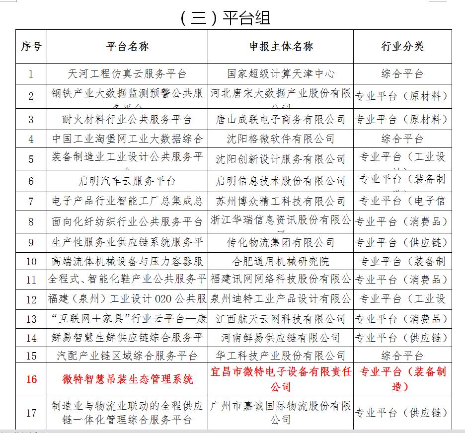 工信部官網(wǎng)公示入選的2017年服務型制造示范企業(yè)(項目、平臺)名單中,全國首批入選服務型制造示范企業(yè)有30家,示范項目60家,示范平臺30家。“微特智慧吊裝生態(tài)管理系統(tǒng)”成功入選服務型制造示范平臺。