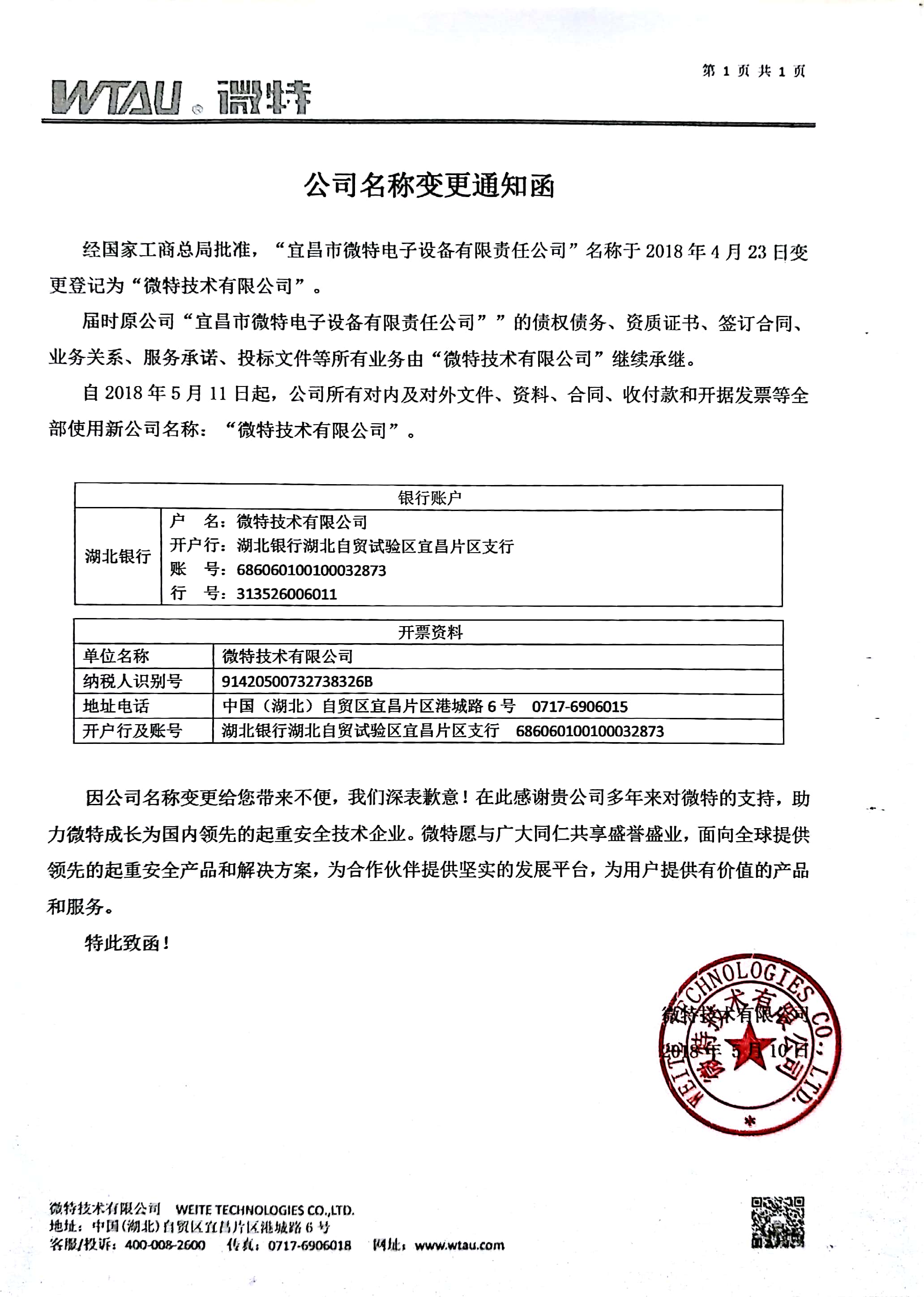 注:自2018年5月11日起,原公司“宜昌市微特電子設(shè)備有限責(zé)任公司””的債權(quán)債務(wù)、資質(zhì)證書、簽訂合同、業(yè)務(wù)關(guān)系、服務(wù)承諾、投標(biāo)文件等所有業(yè)務(wù)由“微特技術(shù)有限公司”繼續(xù)承繼。公司所有對(duì)內(nèi)及對(duì)外文件、資料、合同、收付款和開據(jù)發(fā)票等全部使用新公司名稱:“微特技術(shù)有限公司”。