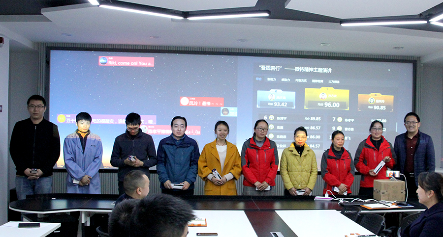 2018年11月17日,2018“吾踐吾行”微特精神主題演講賽在公司隆重舉行,總經(jīng)理聶道靜和各部門主管參加活動(dòng)并做為評委對演講者評分。此次比賽在公司內(nèi)部全程網(wǎng)絡(luò)直播,很多出差在外的人員也可以與現(xiàn)場互動(dòng)。此次活動(dòng)各部門積極踴躍參與,優(yōu)選出12名參賽選手現(xiàn)場演講,選手們結(jié)合微特精神闡述了自己一年以來對工作的感悟和啟發(fā)。